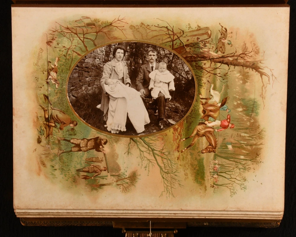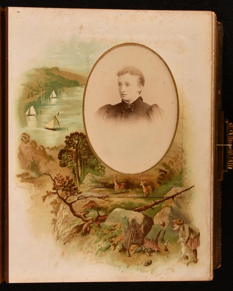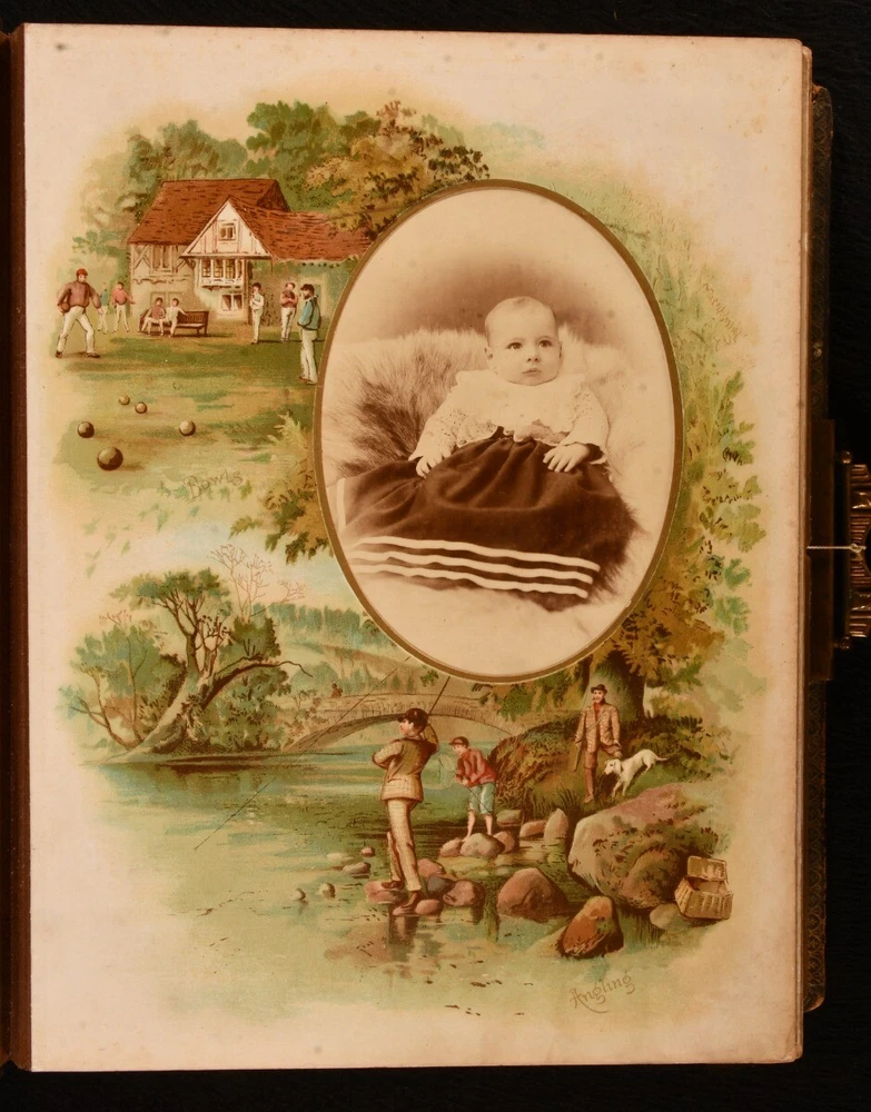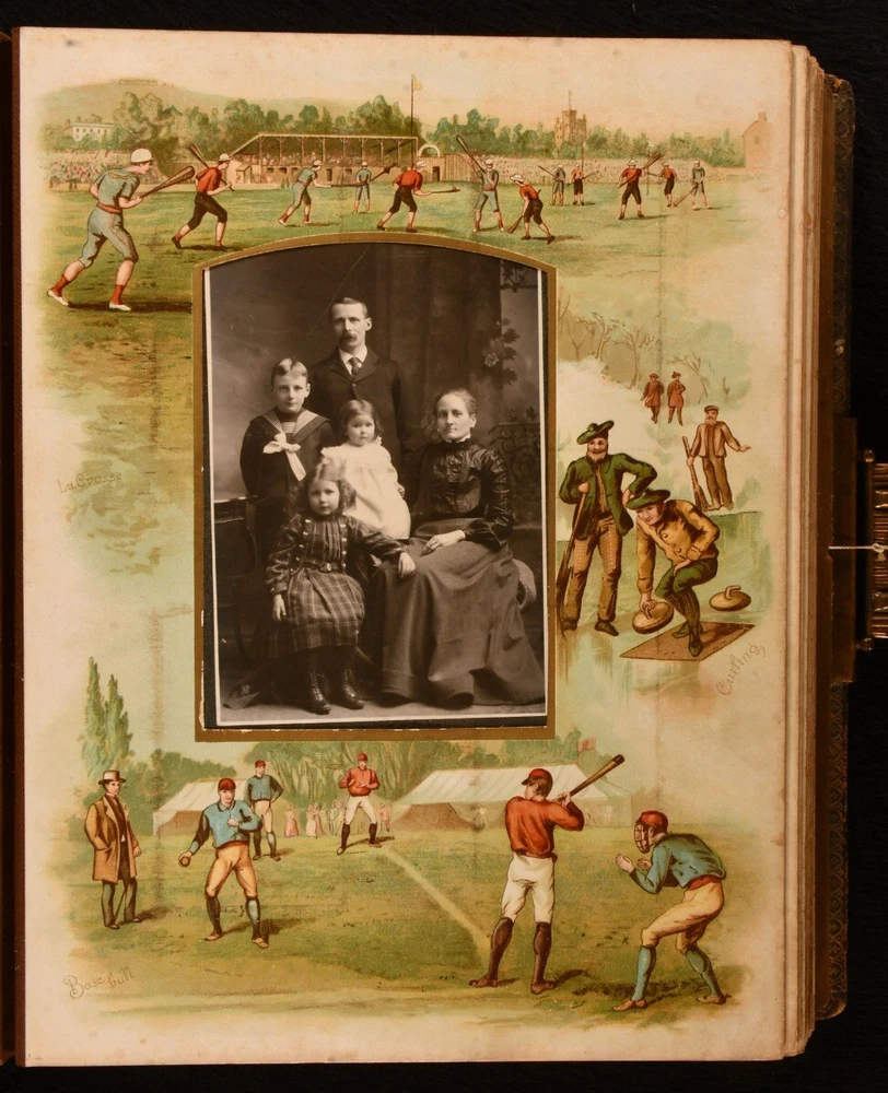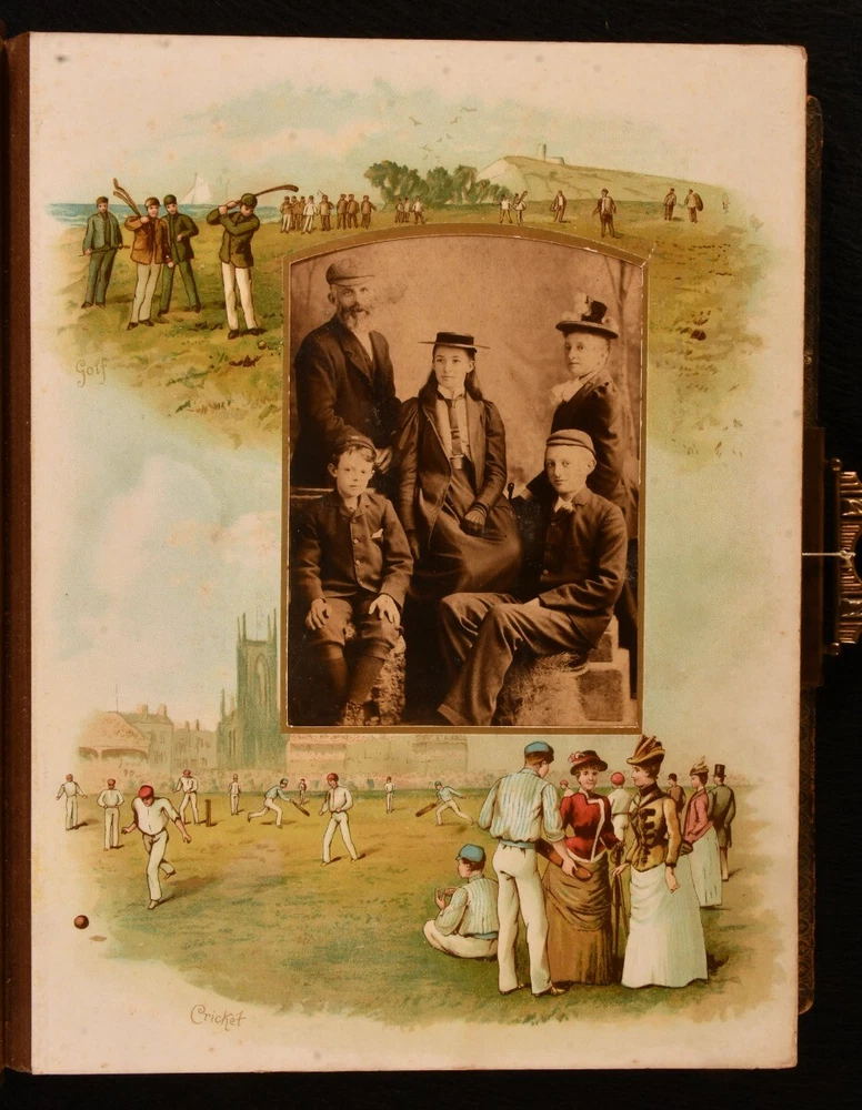 Click here to see our other books! Olympia Not Stated c1890 W. H. S. Thompson, H. Burnett, & Others : Germany 12" by 9" Unpaginated SUMMARY A very scarce Victorian German photo album and music box, an exceptional and unique work. Colour Plates,Illustrated,Leather Binding,Publishers' Original Binding,Very Scarce Overall Condition: Very Good This book weighs 5 KG when packed UK Postage: £ 4.49 US Postage: £ 42.99 EU Postage : £ 27.99 European Postage: £ 45.99 Asia Postage: £ 74.99 Worldwide Postage: £ 129.99 DESCRIPTION A very scarce and unique German made photo album, complete with a music box. The album is highlighted throughout with vivid chromolithographs, which depicts scenes of tennis, baseball, football, cricket, skiing, and more. Illustrated with a total of eleven striking chromolithographs. This beautiful album contains fifty-seven mounted photographs, and two photographs loosely inserted. The music box is fully operational, a comb and cylinder device mounted in the rear paste down. Including the original key, which can be inserted into a winding hole to the rear board. The music box is now operated by a string attached to the brass clasp, which can be pulled to play the song. One mounted photograph has the names Evelyn and Kathleen Richardson in pencil. CONDITION In a full morocco binding, rebacked with the original embossed boards restores. Externally, generally smart, with light fading and rubbing to the boards, rubbing a little heavier to the extremities. Minor bumping to the extremities. Small bookplate to the front paste down. Internally, firmly bound. Pages are bright and generally clean with some spots. A few very small closed tears to the leaves, with small tape repairs. Photographs are generally bright with some fading and spots. Overall Condition: Very Good GLOSSARY OF TERMS Overall Condition (Dustwrapper condition rating is shown after that for the book itself, where a dustwrapper is present) Fine - Very well preserved copy showing very little wear Very Good Indeed - Only one or two minor faults, really a very attractive copy Very Good - Quite a wide term meaning no major faults but probably several smaller ones often expected given the age of the book, but still a respectable copy Good - Meaning not very good. Some more serious faults as will be described in the condition report under 'condition' Good Only - Meaning one or more faults that could really do with repair Fair - As with good only above but with other faults leaving a compromised copy even after repair Poor - Really bad and possibly seriously incomplete. We only sell books in this condition where their rarity or value makes them attractive none the less. Major defects will be described. GUARANTEE We offer a full money back guarantee on our descriptions. Please ask for details and conditions. We prefer PAYPAL. If you pay via PAYPAL we will post the item off the same or the next working day with the postage you have selected. Please note we cannot accept USD cheques