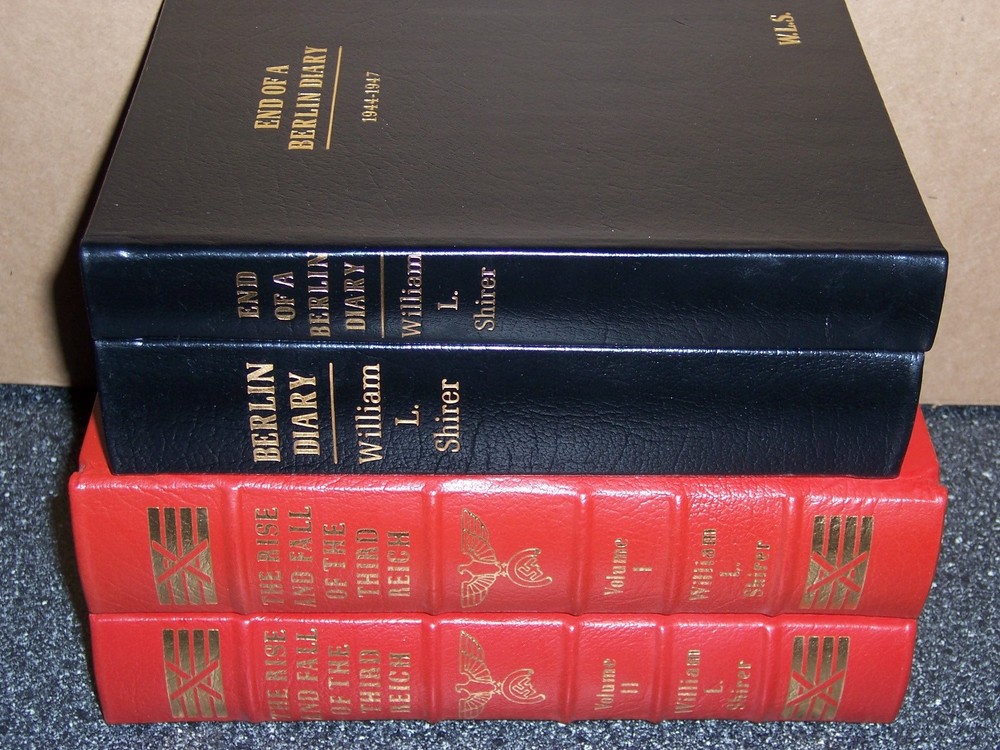 Books from Easton Press Bound in premium leathers, distinctive cover design, hubbed spine accented in 22-karat gold Endsheets of rich moire fabric, permanent satin ribbon page marker Thread sewn pages for strength and durability, gilded page edges for beauty and protection Handsome readable typefaces, beautiful illustrations, archival-quality acid-neutral paper TITLE RISE & FALL OF THE THIRD REICH Collection, in 4 vols AUTHOR William L Shirer MORE DETAILS the first two books are in leather bound hardcover the last two books in leather bound thinner hardcover 1. THE RISE AND FALL OF THE THIRD REICH: Vol. I 2. THE RISE AND FALL OF THE THIRD REICH: Vol. II 3. BERLIN DIARY: The journal of a foreign correspondent, 1934-1941 4. END OF A BERLIN DIARY: 1944-1947 DESCRIPTION Like new condition, unread, clean inside, tight hardcover binding SHIPPING Books will be packed safely, and shipped via USPS Media Mail with tracking number.