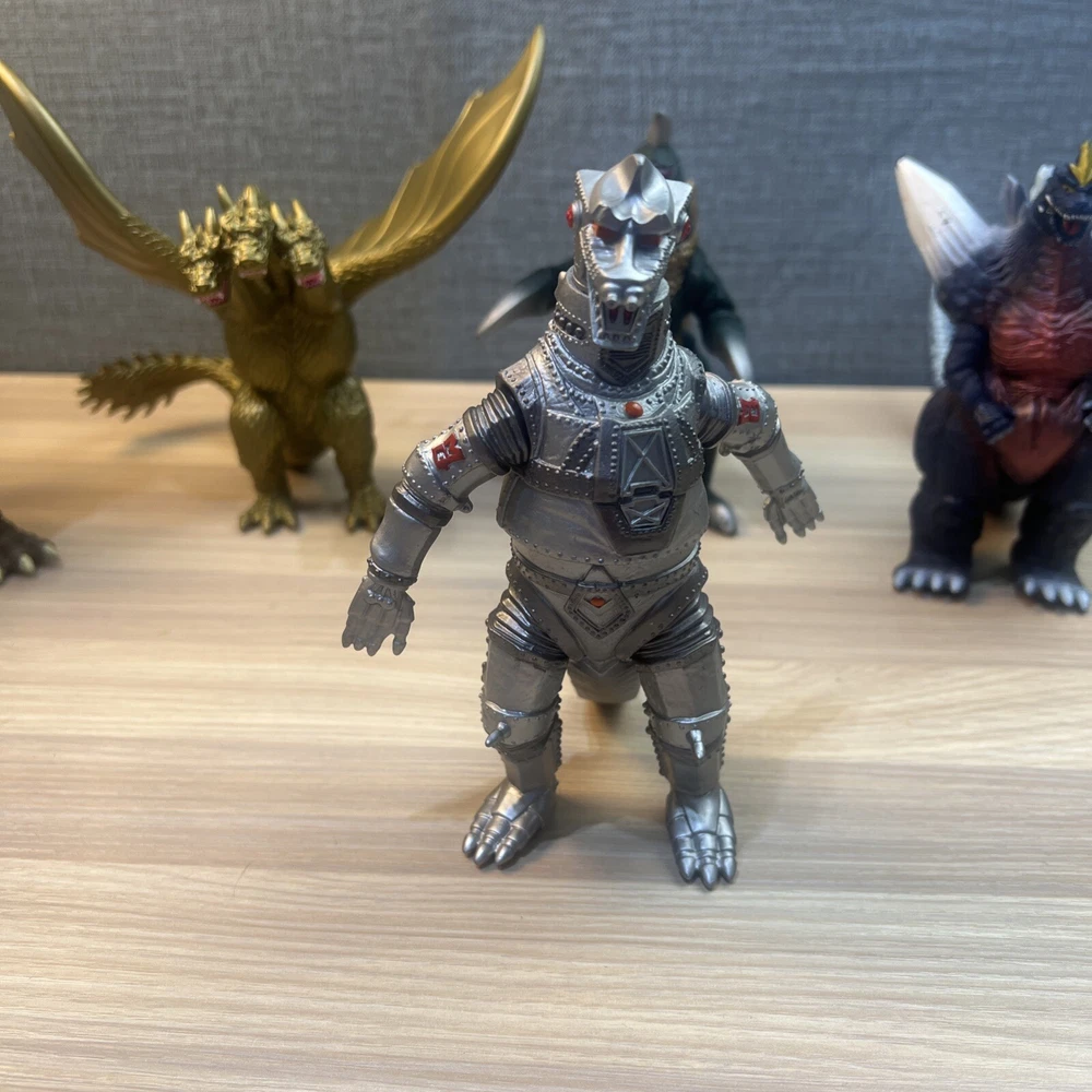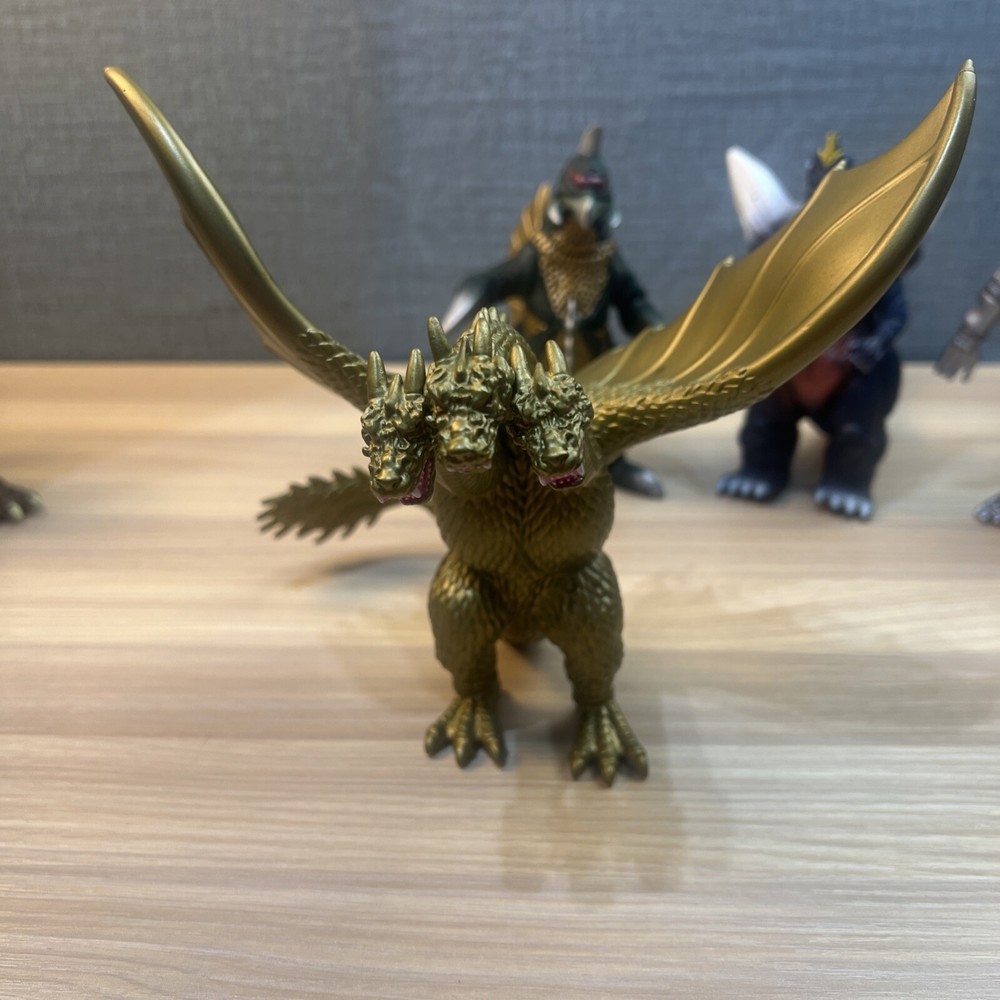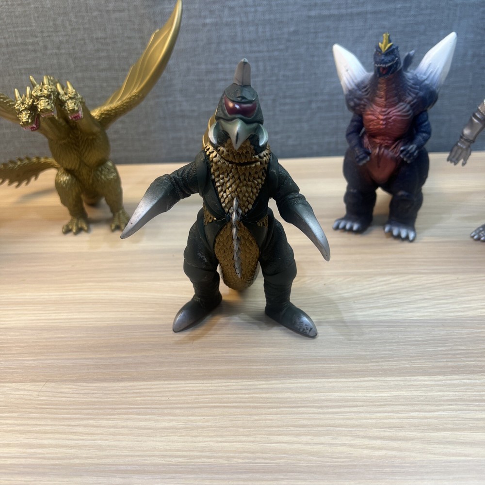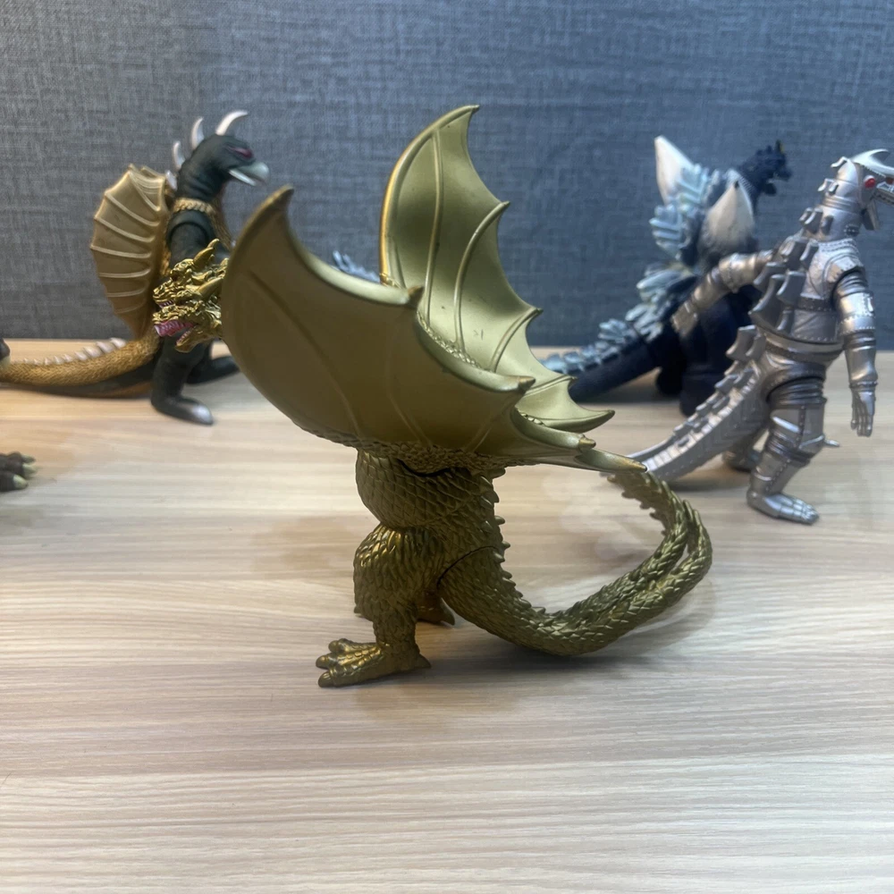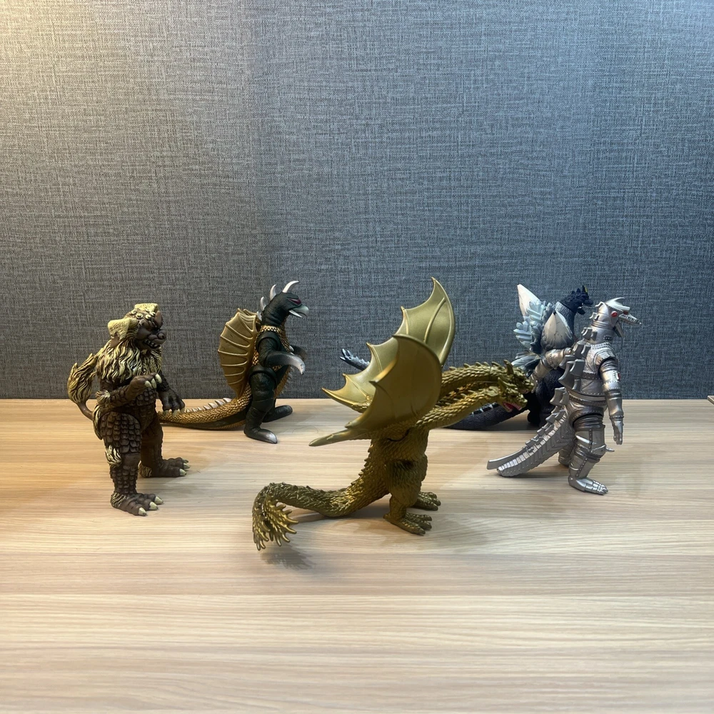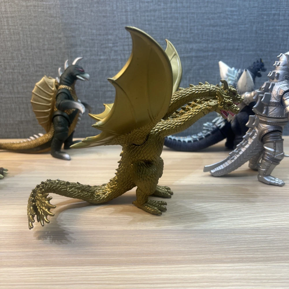 This product is a lot of 5 Godzilla figures featuring Mechagodzilla, King Caesar (Shisa), King Ghidorah, Space Godzilla, and Gigan. The figures are made by Bandai and are part of the Godzilla theme. Included in lot Mechagodzilla Space Godzilla Gigan King Ghidora King Shisa