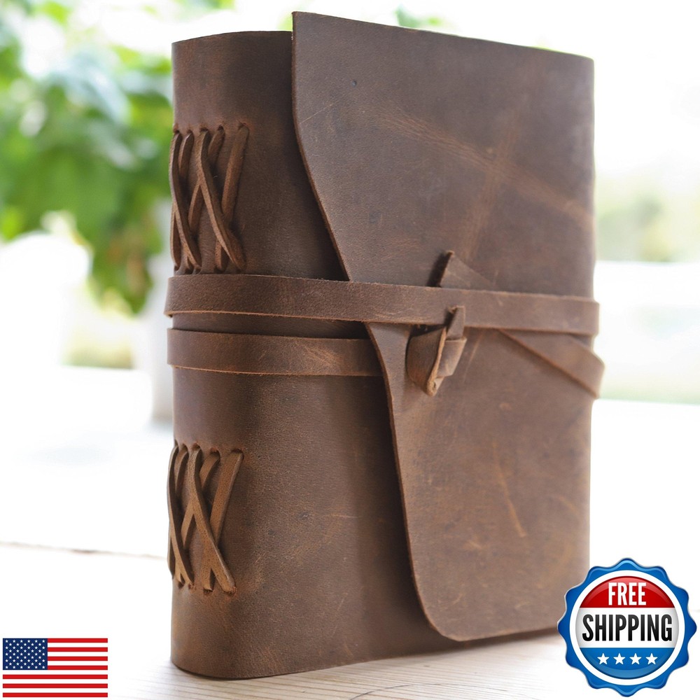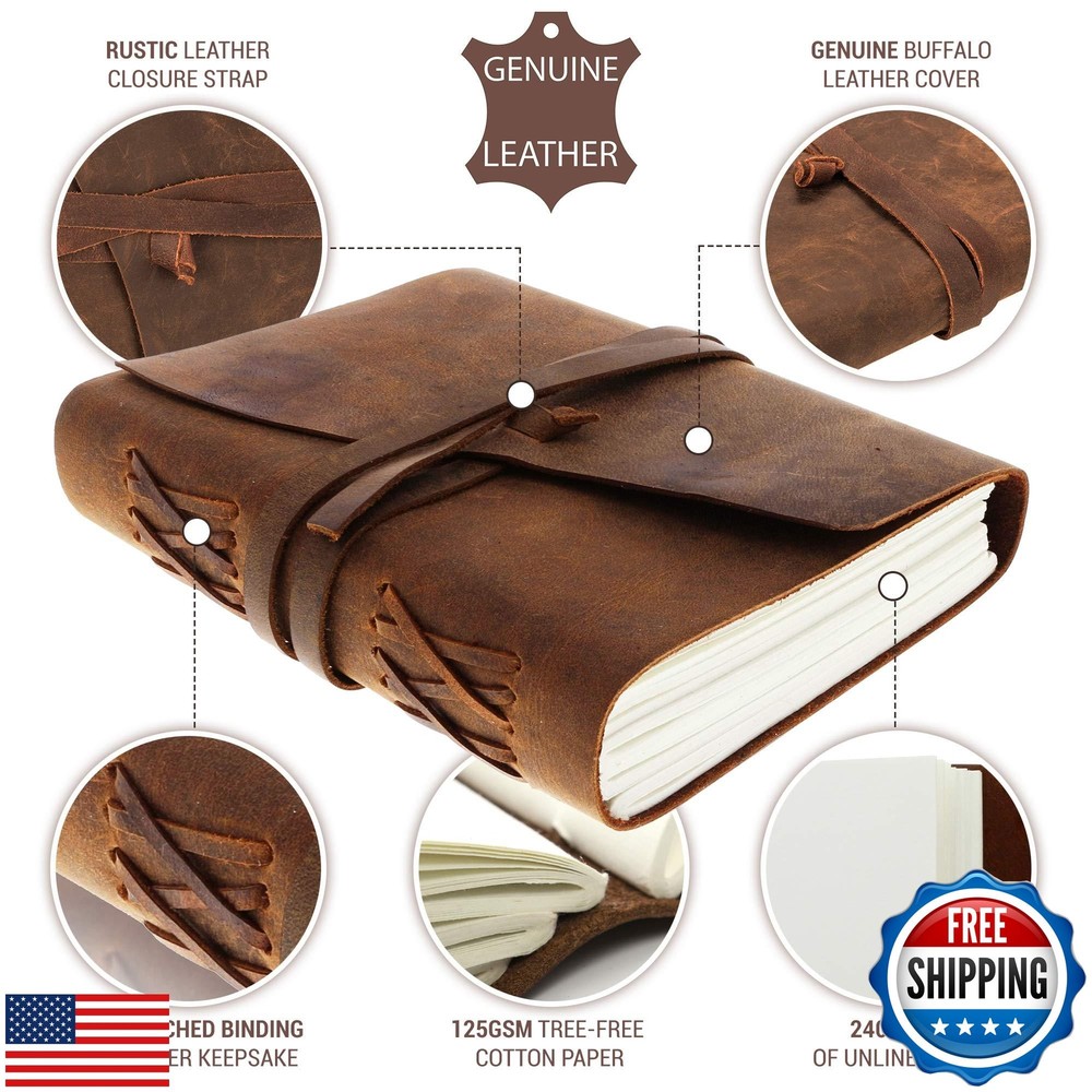 moonster Leather Journal Writing Notebook, Vintage Handmade Bound Notepad for Men and Women - Write in Plain Thick Paper 8x6 Inch Large Blank Pages, Drawing Sketchbook Travel Diary, Unlined Note Book Features UNLIKE THE DISAPPOINTING FAKE LEATHER JOURNALS MADE BY OTHER BRANDS, Moonster’s leather notebook is made of HAND-CUT, 100% GENUINE WATER BUFFALO LEATHER and premium RECYCLED COTTON PAPER. Handmade in India, our Leather Bound Journal features a BEAUTIFULLY CRAFTED, AUTHENTIC DESIGN that will leave its recipients in awe. WHILE MANY FAUX LEATHER JOURNALS ARE CONSTRUCTED POORLY, WITH GLUED-ON BINDINGS AND PAGES THAT FALL OUT, our writing journal is a keepsake you’ll have forever, with a HAND-STITCHED COPTIC LEATHER BINDING for pages that stay firmly in place. Filled with 120 sheets/240 pages of creamy, unlined PREMIUM COTTON PAPER recycled from leftover garment industry cloth in India, our travel journal note book is TREE-FREE AND ACID-FREE. This blank journal LIES FLAT, making it a pleasure to write in. THE AVERAGE DAILY JOURNAL IS FILLED WITH LOW-QUALITY PAPER THAT degrades the journaling experience. Our writing journals are made with TOP-GRADE MATERIALS, featuring PREMIUM 125gsm EARTH-FRIENDLY PLAIN PAPER that is perfect to write on. NO BLEED THROUGH: Use any ballpoint pen or a slow-flow fountain pen on the handcrafted paper sheets. A HANDSOME, THOUGHTFUL GIFT THAT GIVES BACK. For every purchase made, Moonster gives a percentage of its profits to their favorite charity in Africa, that works to PREVENT AND PROTECT CHILDREN FROM CRUELTY AND ABUSE. Our journal for men & women comes beautifully wrapped in an earth-friendly COTTON BAG. Choose between two sizes: 5”X7” OR 8”x6” – the perfect size for travel! ALSO AVAILABLE IN GIFT SETS (Search: B06XDQG92X) AT MOONSTER, WE LOVE CREATING BEAUTIFUL HANDMADE LEATHER PRODUCTS our customers love as much as we do – and GIVING BACK while we do it. We are a small, family-run business & so is our main supplier in India, EMPLOYING LOCAL ARTISANS who produce the gorgeous products we feel privileged to sell. All of our leather travel bags for men are HANDMADE & ETHICALLY SOURCED using SUSTAINABLE & RECYCLED MATERIALS wherever possible. Shipping Free & Fast Shipping: We offer free shipping to most of the USA with a normal delivery time of 3-7 days. However, due to the current situation, additional delivery time (up to 3 weeks) may be required for some items. Alternative Carriers: We may use alternative carriers (e.g., USPS, FedEx, UPS) to ensure your package arrives safely and on time. Due to the use of multiple carriers, we are unable to provide a tracking number automatically. Handling Time: Orders are processed and shipped within 1-2 business days of receiving cleared payment. Shipping Restrictions: Shipping to Alaska, Hawaii, Puerto Rico, Guam, and other US territories may incur shipping charges or delivery restrictions. Please contact us before ordering, or your order can be refunded/cancelled. State Restrictions: Certain items may not be shipped to California due to state regulations. Contact for Tracking Updates: If you require tracking updates or have any concerns about the delivery of your order, please feel free to contact us, and we will be happy to assist you. Return Policy 30-Day Hassle-Free Returns: If you are not completely satisfied with your purchase, you can return the item for free within 30 days of receiving it for a full refund or exchange. Easy Return Process: Contact us, and we will provide you with a prepaid return shipping label and detailed instructions. No Restocking Fee: There are no restocking fees for returns. However, the buyer is responsible for return shipping costs if the return is not due to a seller's error. Refund Processing: Refunds will be processed within 1 business day of receiving the returned item in its original condition. Payment We accept all major credit cards, PayPal, and Apple Pay for your convenience. Your payment information is secure and encrypted to ensure a safe and seamless transaction. Please complete your payment within 3 days of purchase to avoid any delays in shipping. Feedback Your feedback is extremely important to us. We strive to provide the best products and customer service possible. If you are satisfied with your purchase, please take a moment to leave us a positive review. If you have any concerns or issues with your order, please contact us before leaving negative feedback. We are committed to resolving any problems and ensuring your satisfaction. Contact Us If you have any questions or concerns, please feel free to reach out to our customer support team. You can contact us through the eBay messaging system. We are available Monday to Friday, 9:00 am to 5:00 pm EST, and we will do our best to respond to your inquiry within 24 hours. Thank you for supporting our small family business!