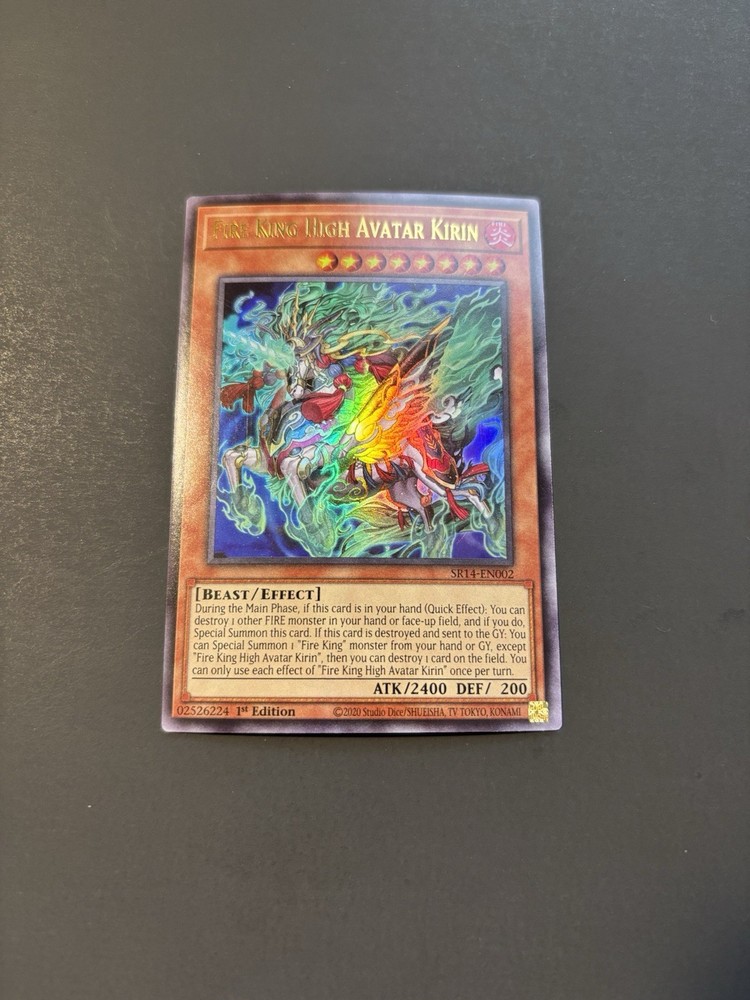 | Card Text | During the Main Phase, if this card is in your hand (Quick Effect): You can destroy 1 other FIRE monster in your hand or face-up field, and if you do, Special Summon this card. If this card is destroyed and sent to the GY: You can Special Summon 1 "Fire King" monster from your hand or GY, except "Fire King High Avatar Kirin", then you can destroy 1 card on the field. You can only use each effect of "Fire King High Avatar Kirin" once per turn. |